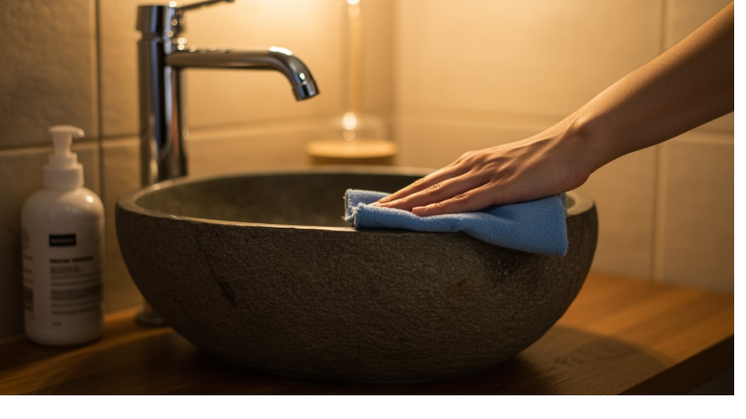 Это действие может показаться излишним, но именно оно — золотое правило ухода за натуральным камнем. Основной уход заключается в том, чтобы каждый раз насухо протирать поверхность мойки. Это не просто рекомендация, а самая эффективная мера против главной проблемы — известкового налета. В любой воде растворены минералы. Когда капли высыхают, вода испаряется, а соли кальция и магния остаются на камне, формируя твердые белесые отложения.